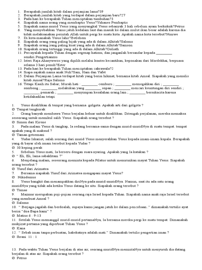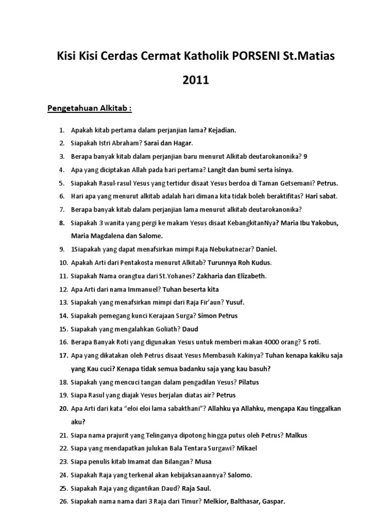 Sekolah minggu rabu, 08 agustus 2012. Kuis cerdas cermat alkitab sekolah minggu doc contoh soal cerdas cermat sekolah minggu, kuis cerdas cermat alkitab sekolah minggu 1 dirumah siapakah siasat untuk menangkap yesus dirundingkan jawaban di rumah imam besar kayafas 2 di kota manakah yesus diurapi oleh seorang perempuan dengan minyak wangi yang sangat mahal Berikut informasi sepenuhnya tentang contoh soal cerdas cermat sekolah minggu. Soal rangking 1 penggalang atau soal olimpiade pramuka beserta kunci. Contoh soal cerdas cermat alkitab anak sekolah minggu tentang paskah contoh soal terbaru. Siapakah gembala pertama dalam kitab suci? Related image with soal soal alkitab. 3 kali sebelum ayam berkokok jawab. Seorang nabi yang bernubuat tentang uang 30 keping perak yang digunakan untuk membeli tanah tukang periuk? Soal cca (cerdas cermat alkitab) part 1. Sukses test akademik ppg 2019 prediksi soal kompetensi. Unknown 23 oktober 2018 2219. Siapakah yang mengutuk pohon ara karena tidak berbuah?