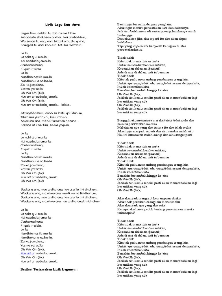 Berikut ini lirik lagu 'kun anta' milik . Dalam bahasa arab dan terjemahannya dalam arti lirik bahasa indonesia:. Lirik terjemahan arti kun anta bahasa indonesia #kun #anta #bahasa #arti #terjemahan #lyrics #lagu · suggested by awakeningrecordsltd · music in . Lirik lagu kun anta ini bercerita tentang seseorang yang ingin seperti orang lain yang digemarinya, terutama penampilannya. Lirik lagu kun anta ini sangat panjang, maknanya pun juga indah dan mendidik kita untuk menjadi diri sendiri.